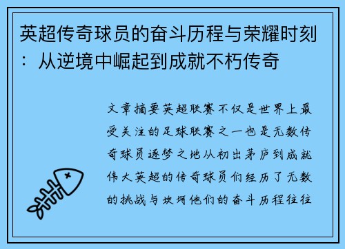 英超传奇球员的奋斗历程与荣耀时刻:从逆境中崛起到成就不朽传奇