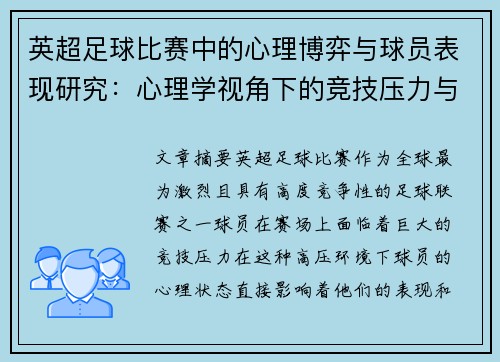 英超足球比赛中的心理博弈与球员表现研究:心理学视角下的竞技压力与决策分析